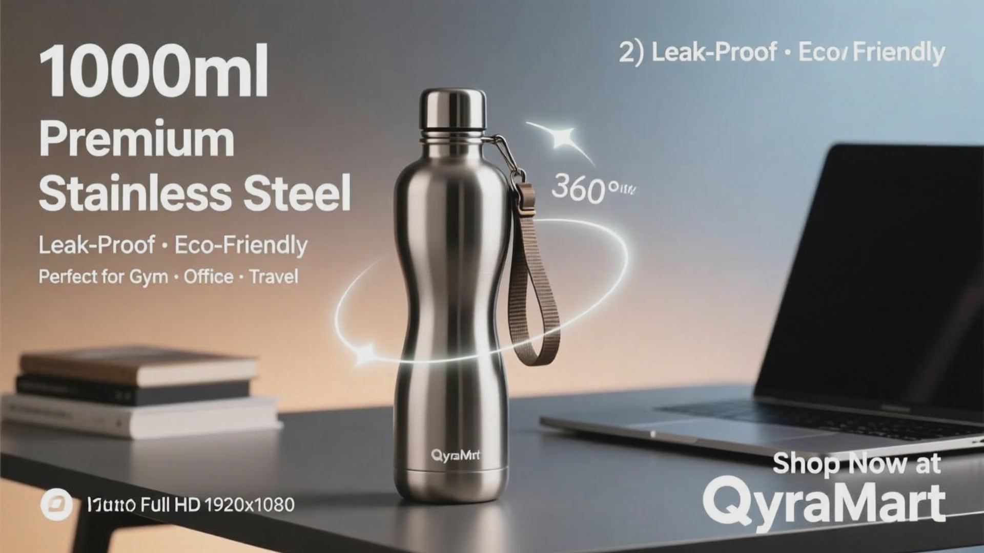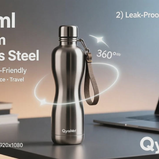 QyraMart™ Curved Stainless Steel Water Bottle | 1000ml | Leak-Proof & Travel Friendly